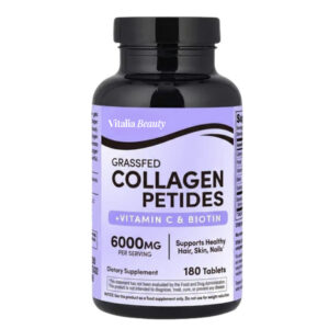 Vitalia Beauty Grassfed Collagen Peptides Tablets comes in at $1.80 per day on a single bottle, dropping to $1.60 per day on a 6-month subscription. 6,000mg of grassfed collagen. Vitamin C + Biotin included. Third-party tested. Tablet format. 60-day guarantee.